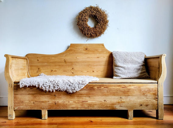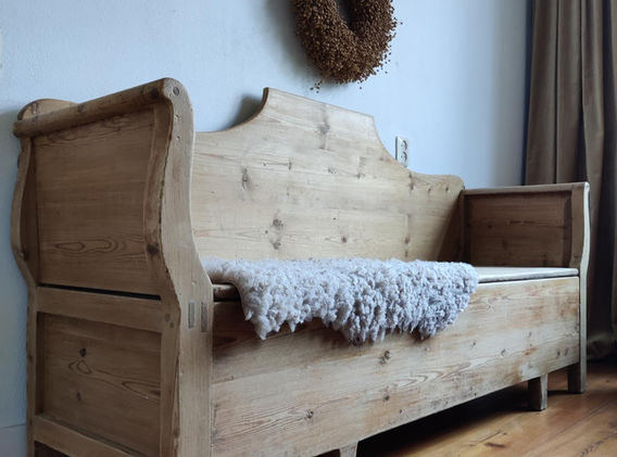 Prachtige antieke Zweedse klepbank (kökssoffa).
