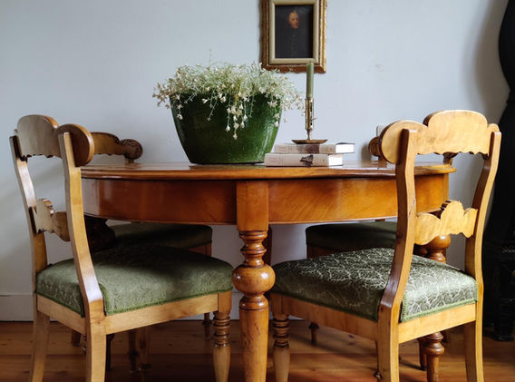 Prachtige eetkamertafel of matbord (ca.1840) met vier stoelen, waarbij de tafel uit twee delen bestaat en ook als halve maan tafel te gebruiken is.